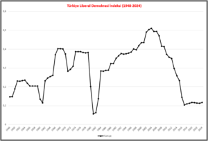 This finding is also reflected in major global indices that assess countries’ political regimes. For instance, the following graph, based on the Liberal Democracy Index in the 2025 Democracy Report published most recently on 12 March 2025 by the V-Dem Institute at the University of Gothenburg, shows that Turkey is going through one of the worst periods in recent history in terms of democratic values. The only worse period was during the 12 September 1980 Military Coup.